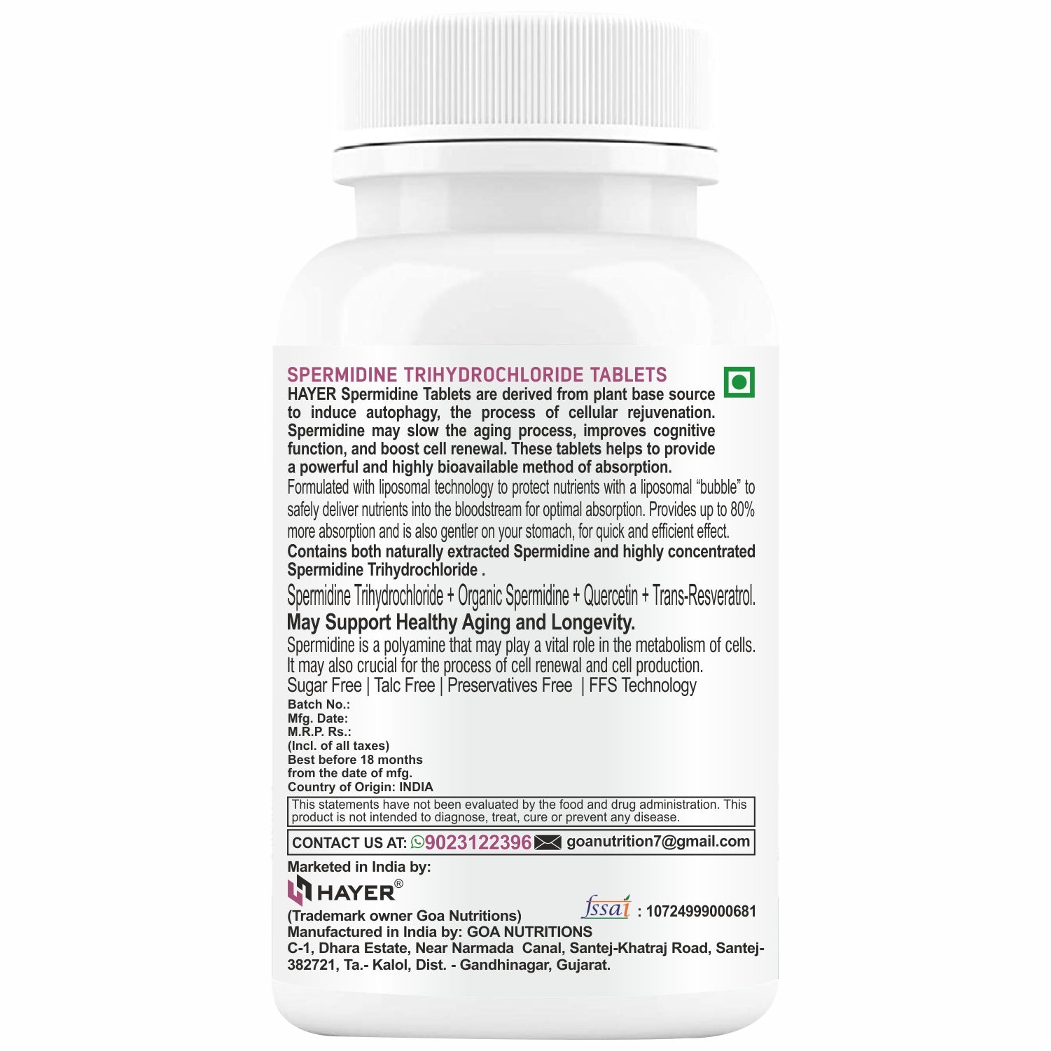 • Good Health Supplement: Spermidine supplements a crucial nutrient that plays a key role in many biological functions, such as DNA strengthening, energy production, and cellular metabolism. As we age, our spermidine levels naturally decrease, resulting in reduced energy, cognitive decline, and diminished vitality. These spermidine supplements are formulated to help increase spermidine levels, potentially reducing fatigue, supporting healthy aging, and promoting optimal cellular function.